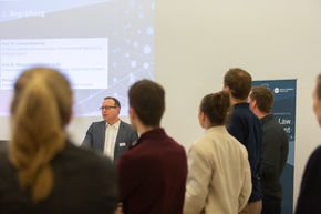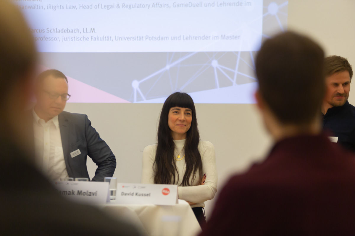 Anschließend beantworteten beide Professoren gemeinsam mit Ramak Molavi (Rechtsanwältin | iRights Law, Head of Legal & Regulatory Affairs | GameDuell) und David Kussel (Studierender des ersten Jahrgangs) in der kurzen Paneldiskussion unterschiedlichste Fragen zum Studiengang und berichteten von ihren persönlichen Eindrücken aus verschiedenen Perspektiven.