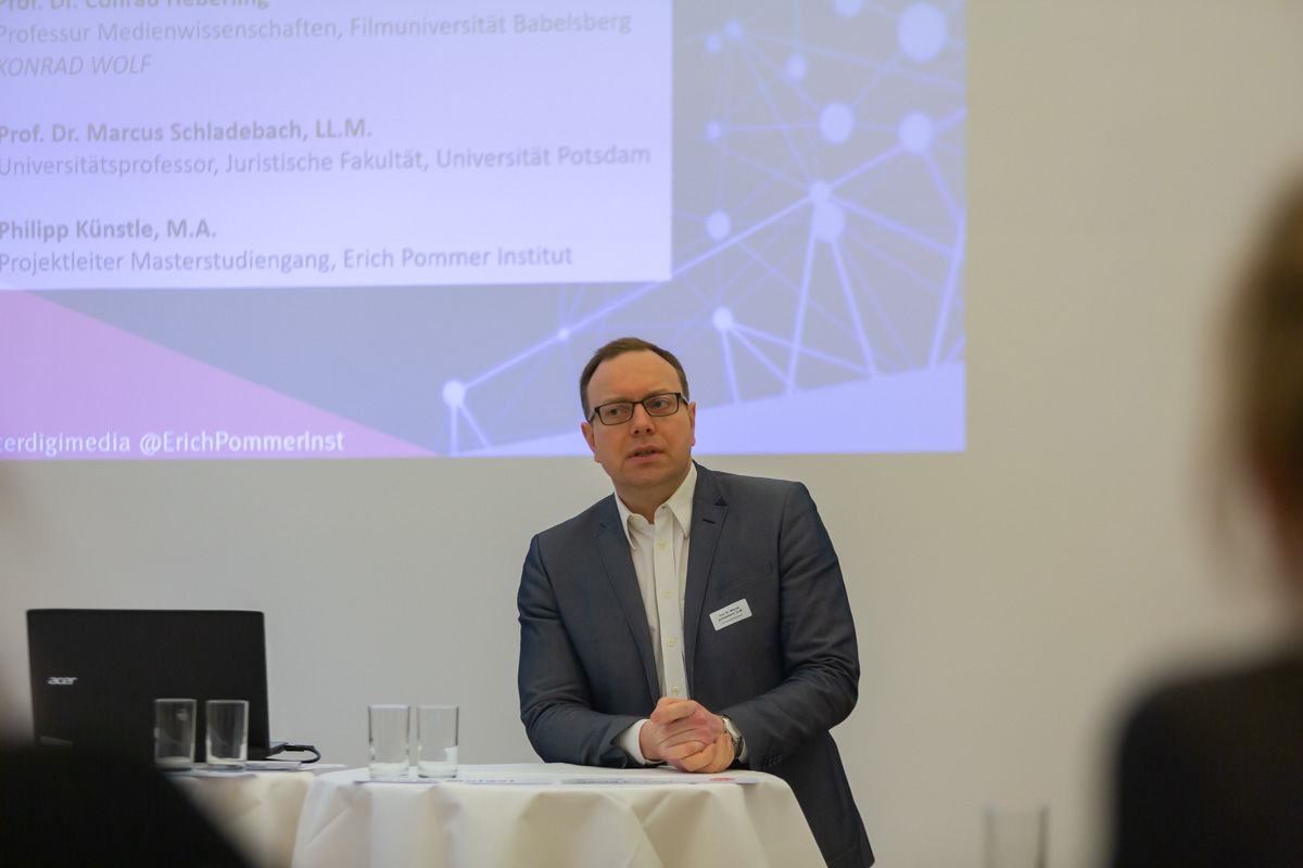 Zunächst begrüßte Prof. Dr. Conrad Heberling im Namen der Filmuniversität Babelsberg KONRAD WOLF alle Anwesenden und übergab anschließend das Wort an Prof. Dr. Marcus Schladebach, LL.M., welcher im Namen der Universität Potsdam ebenfalls alle Interessierten willkommen hieß.